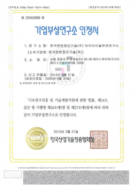 - 기업부설연구소 명칭 변경 - 아카이브솔루션연구소