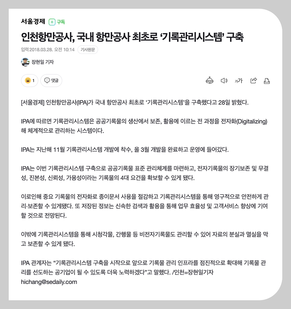 생산시스템과 실시간 연계를 통한 기록물 이관으로 이관 비용 절감(이관 비용 0원)
